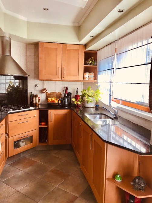 - Cocina con muebles sobre y bajo mesada con vista al parque.