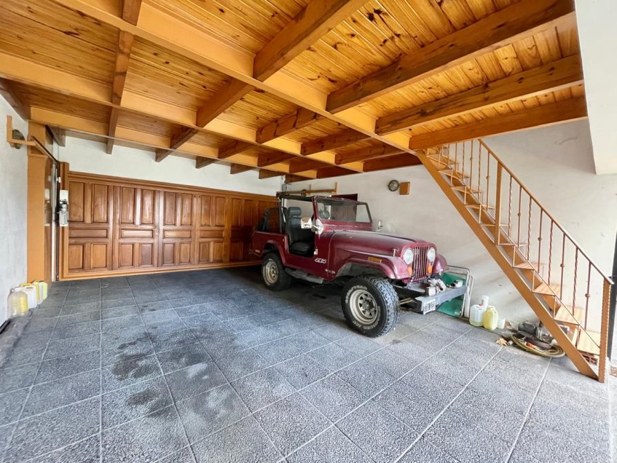 Garage cubierto con portón automatizado, con capacidad para 2 o 3 vehículos en paralelo.